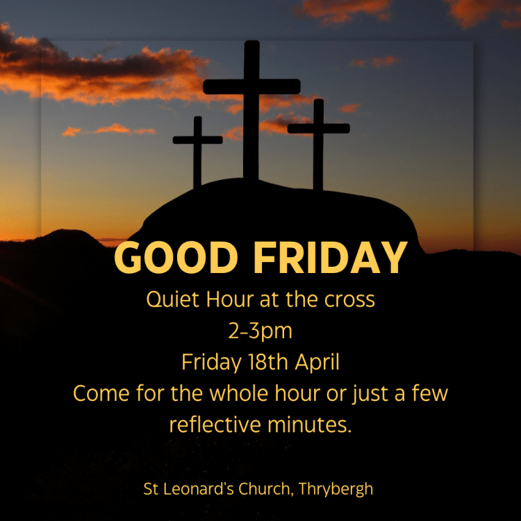 Join us again later in the afternoon for a reflective Quiet Hour at the Cross – all are welcome to stay for the whole hour or just a few minutes.